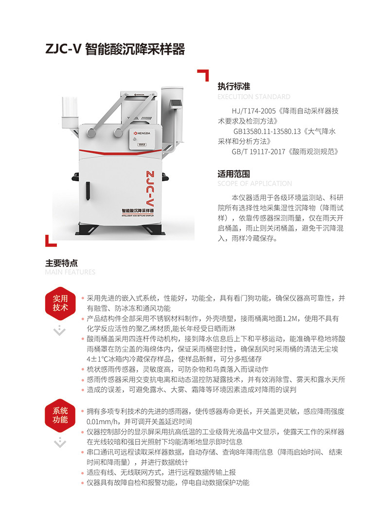 本儀器適用于各級環(huán)境監(jiān)測站、科研院所有選擇性地采集濕性沉降物(降雨試樣),依靠傳感器探測雨量,僅在雨天開啟桶蓋,雨止則關(guān)閉桶蓋,避免干沉降混入,雨樣冷藏保存。